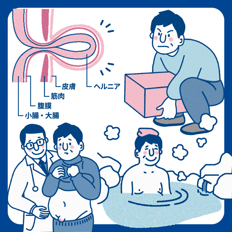 鼠径部ヘルニアは筋膜が弱くなり、腸が皮膚の下に出てしまう病気です。そのため、治療をしないと自然に治ることはありません。